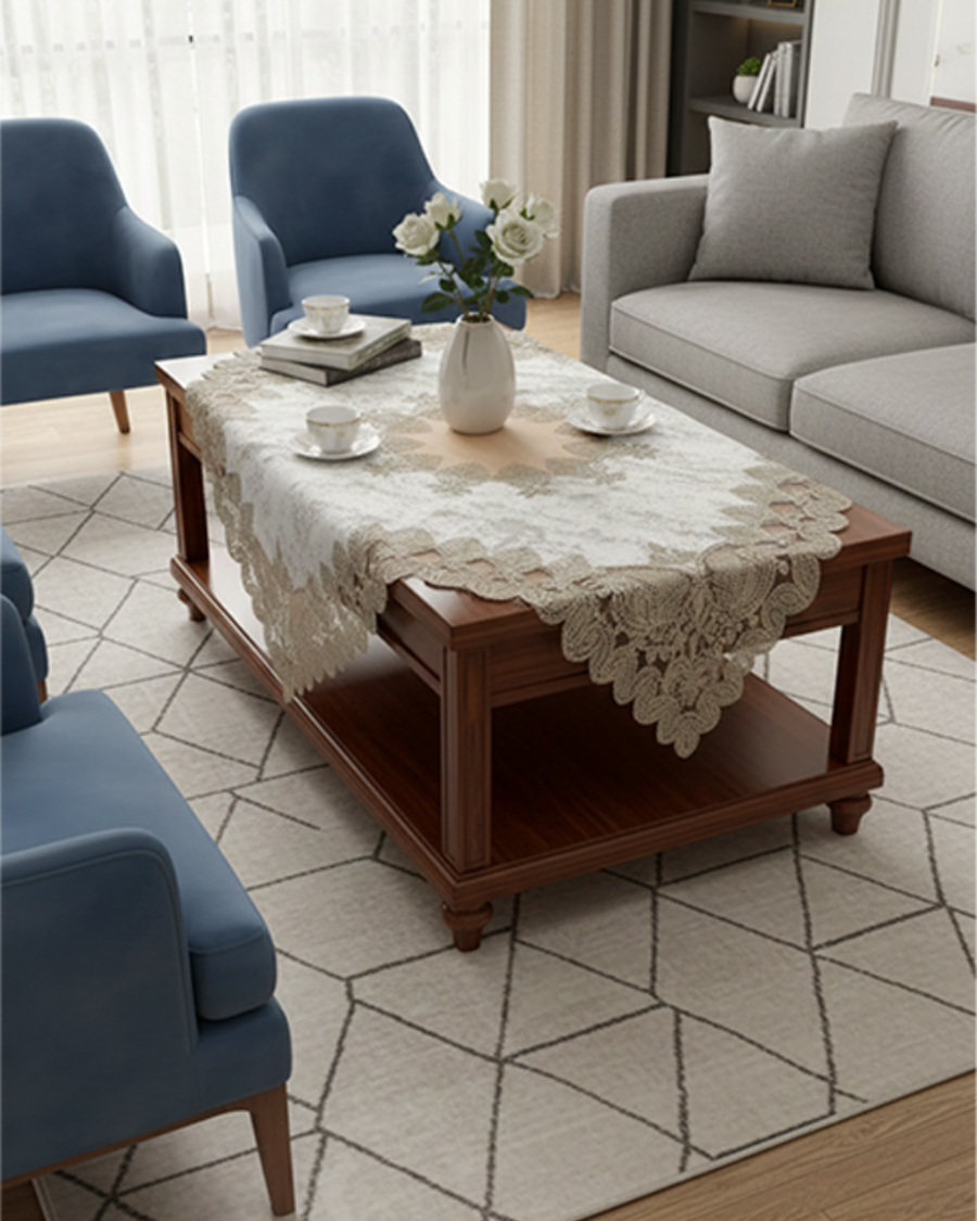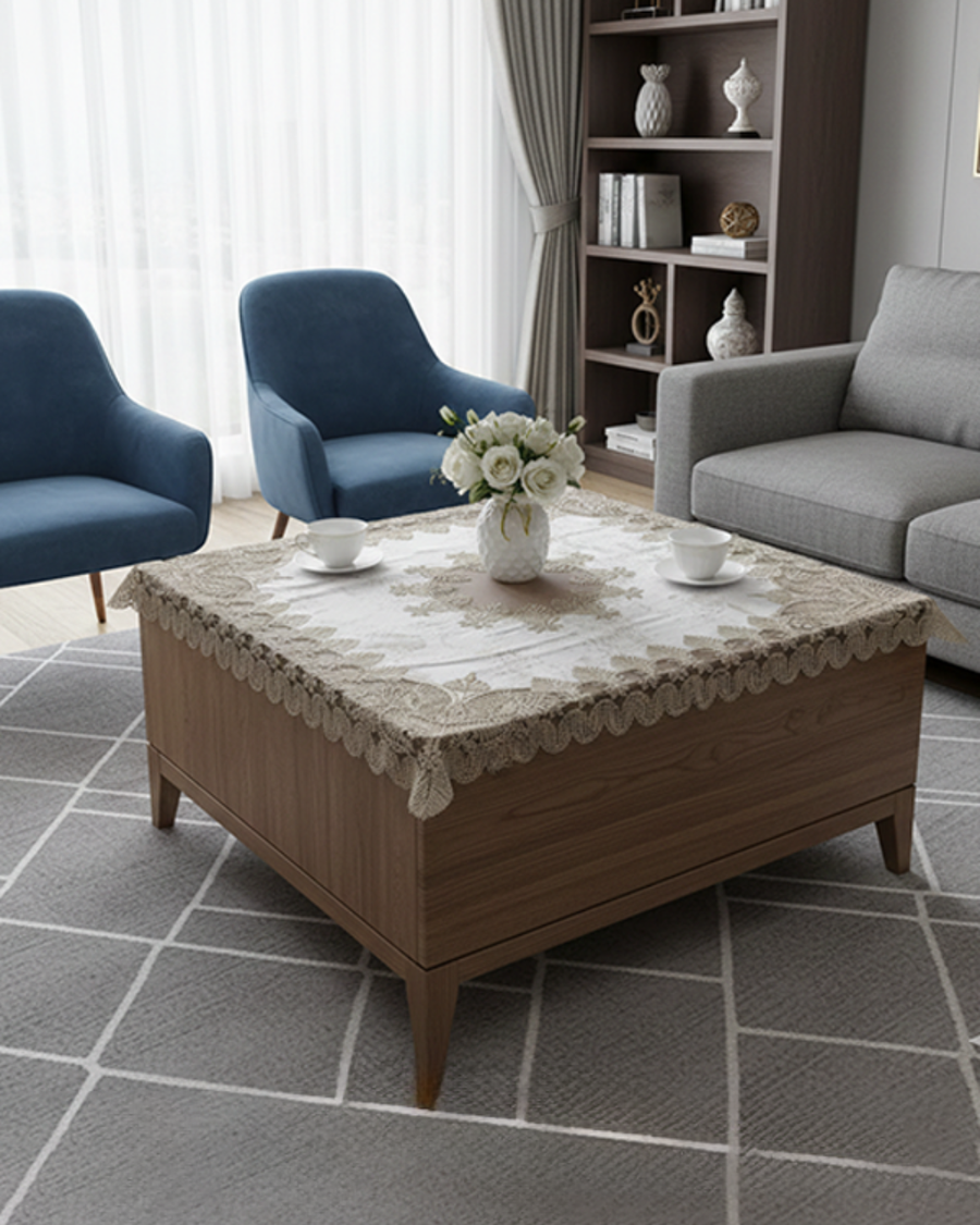 مصنوع من خامة دانتيل ناعمة وجودتها عالية، بيضيف شكل جذاب ومرتب للمكان، ومناسب للاستخدام اليومي أو المناسبات.